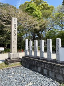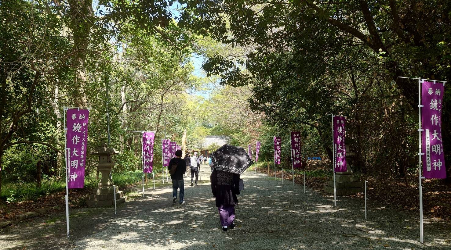 鏡作坐天照御魂神社入口には玉垣(たまがき)、参道にはのぼり、有名なガラス屋さんの名前が