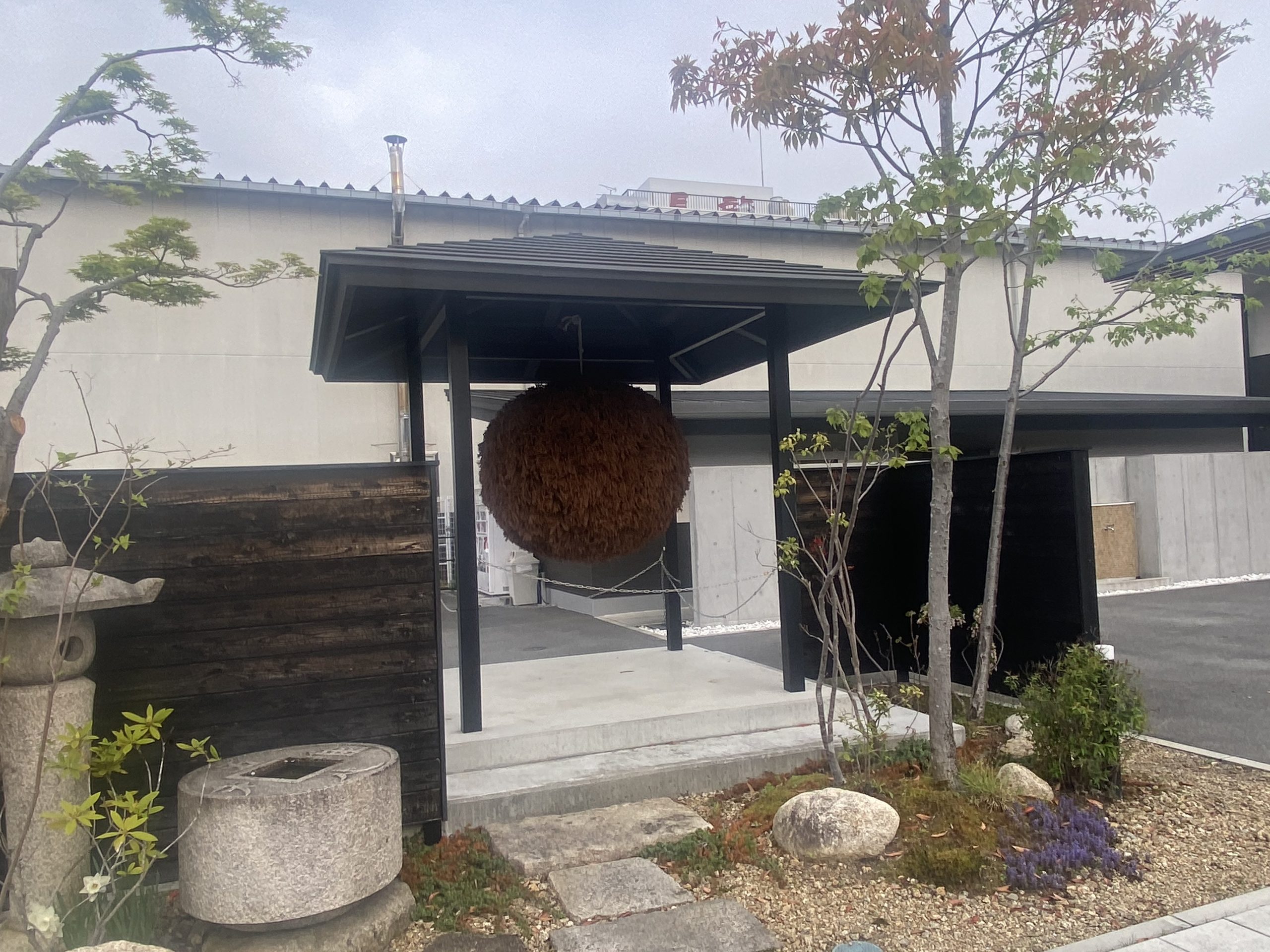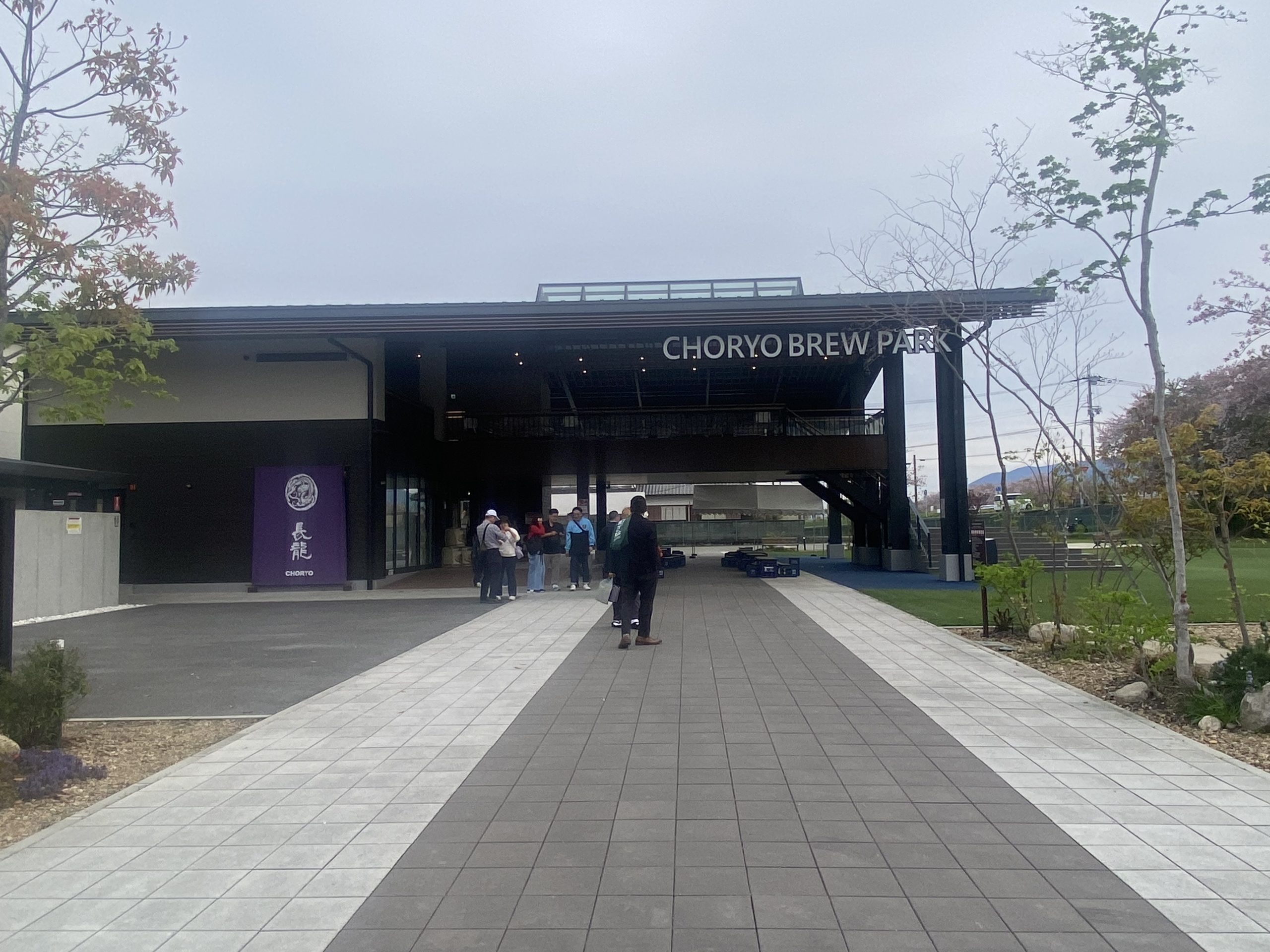 長龍ブリューパーク入口 左には大きい杉玉があり、右には芝生広場がひろがっていました。